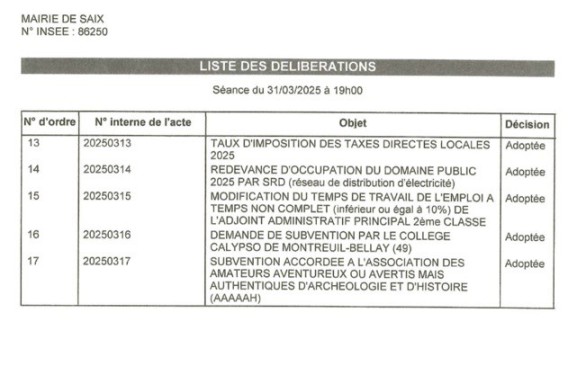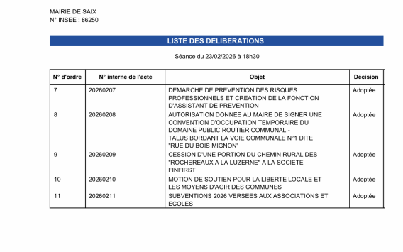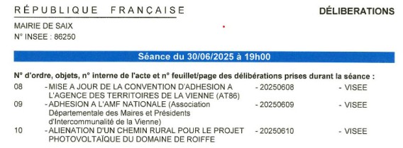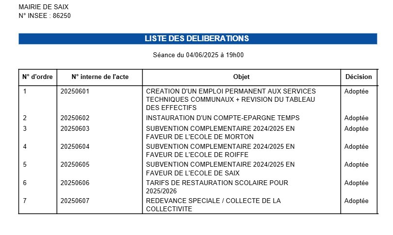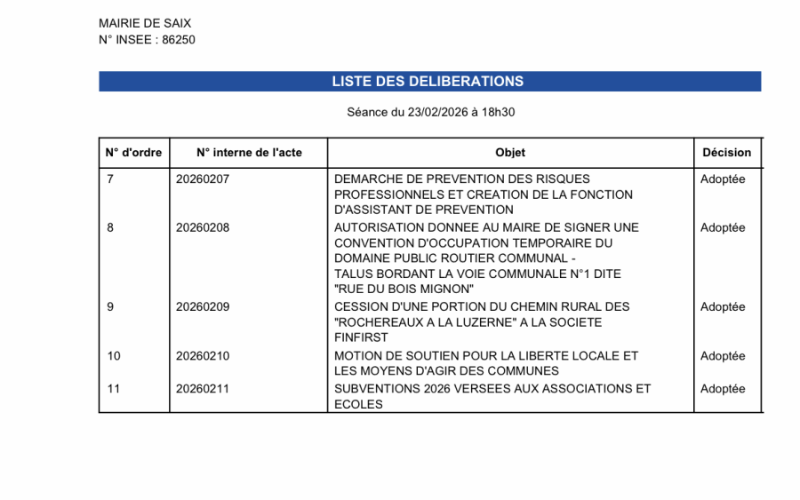 Nous sommes des représentants locaux, élus tous les six ans pour administrer et représenter la commune de SAIX. Le conseil municipal se réunit une fois par mois sur convocation du maire. Les séances sont publiques et toute personne peut y assister tant qu’elle ne trouble pas les débats, cependant certains débats peuvent être menés en huis clos. Les dates et les heures de ces séances sont affichées à la mairie.